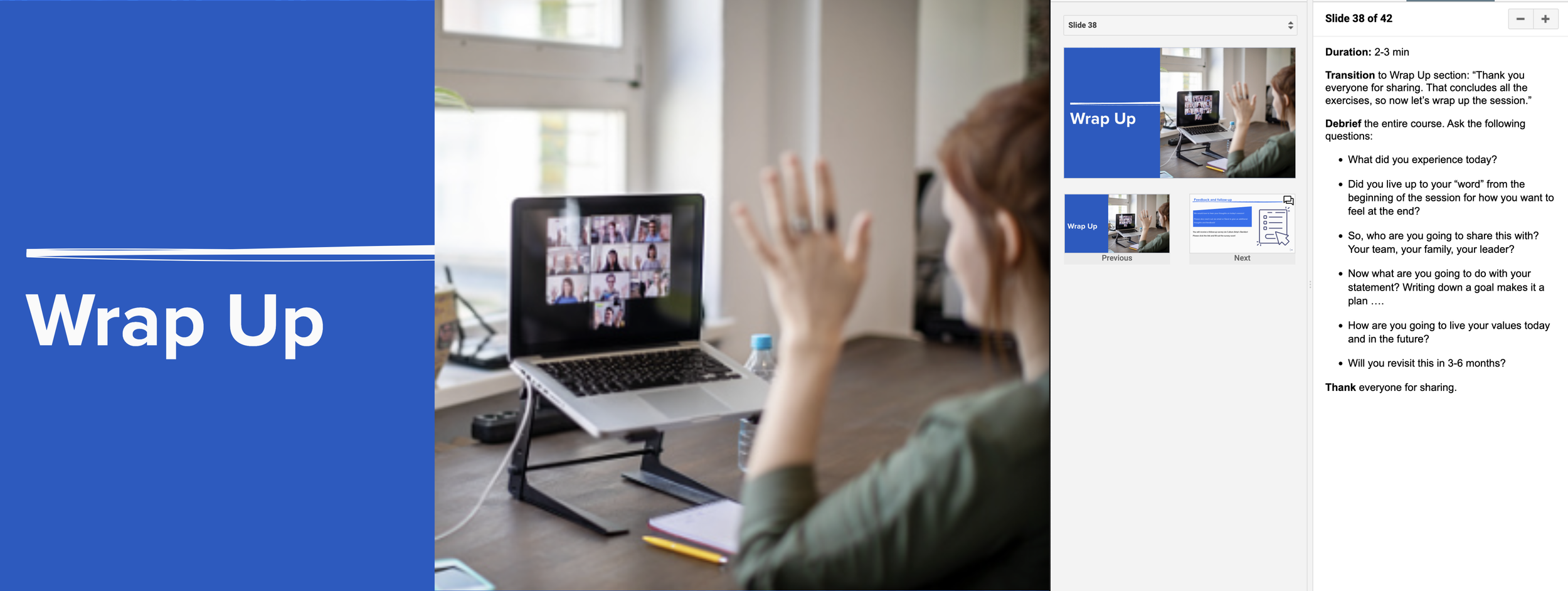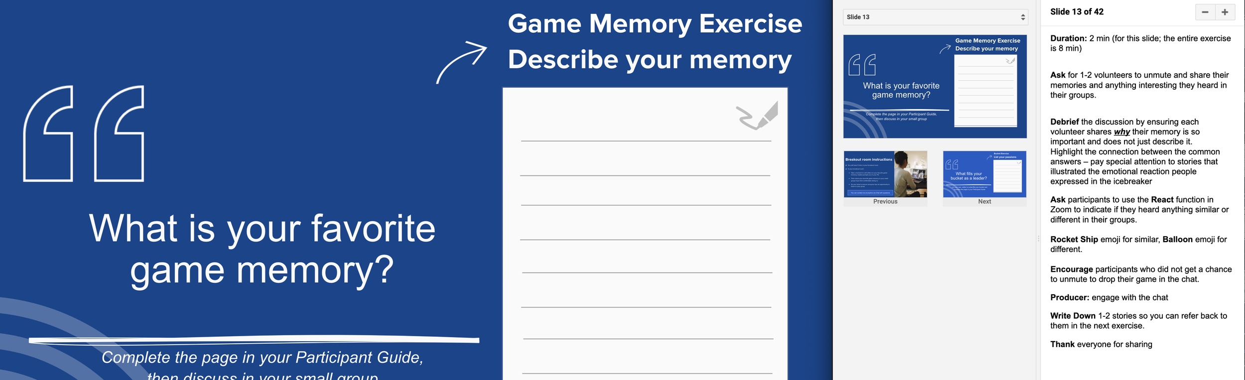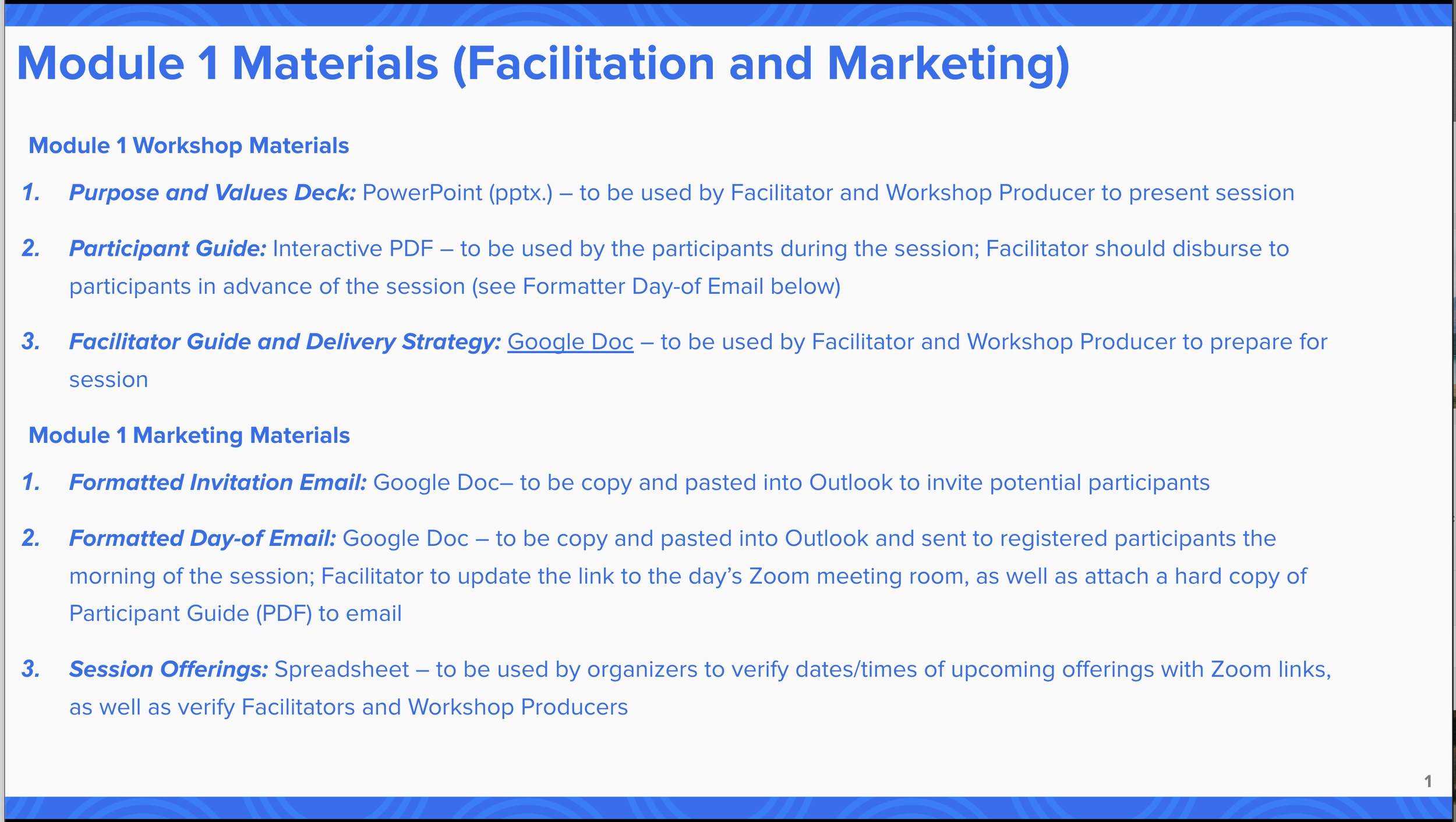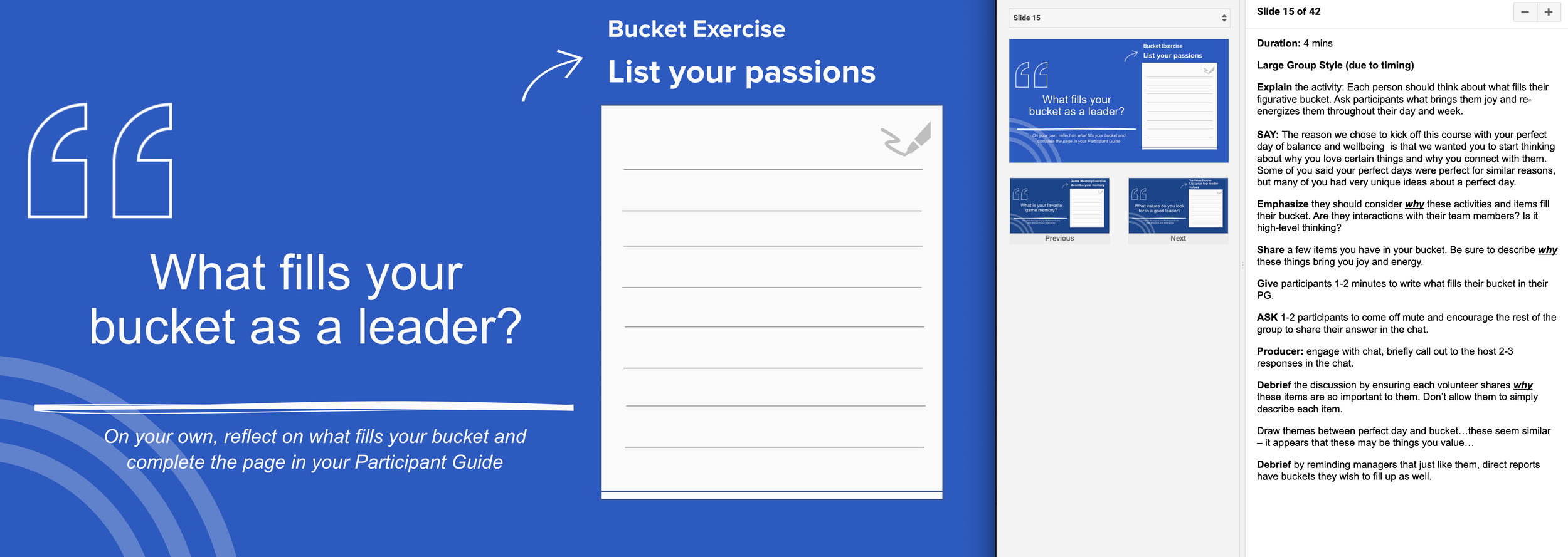 Collateral: The collateral developed was created following WCAG and ADA accessibility standards while remaining in line with the company’s branding guidelines. Facilitator and Producer directions are contained in the speaker notes. A participant guide was created to enhance and enable participant activities in the workshop. A sample of the participant guide can be found under the facilitator slides.
