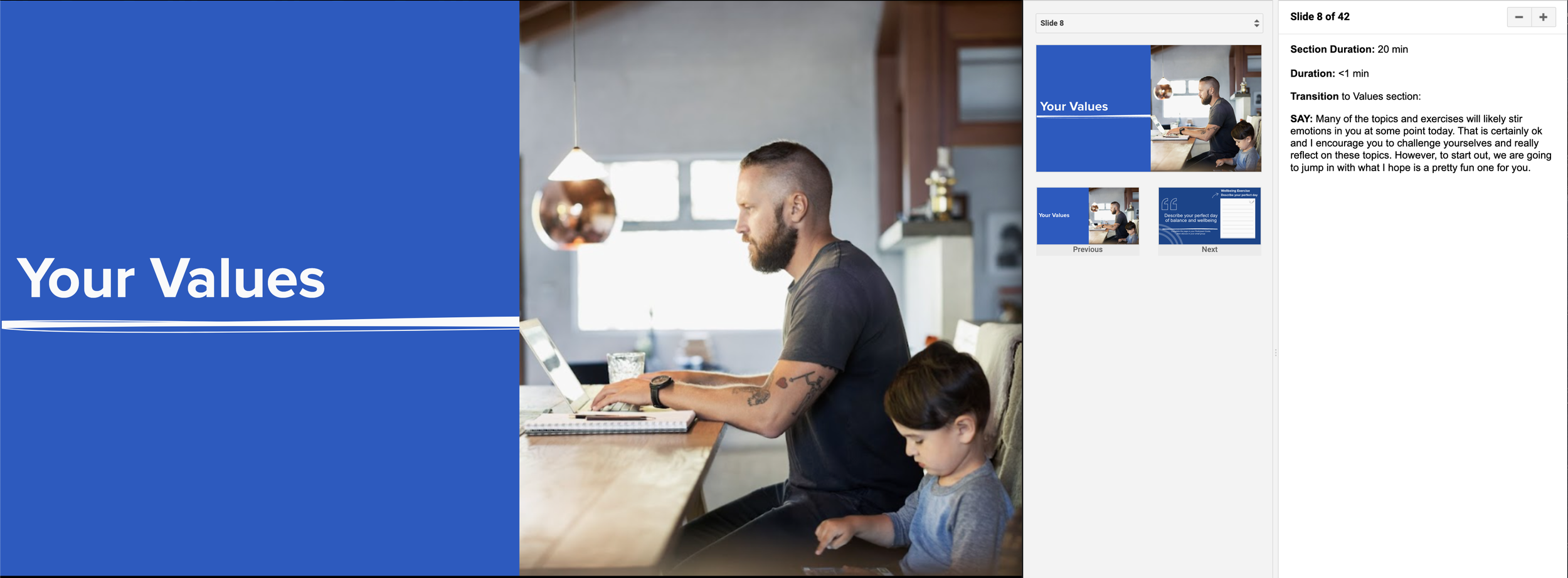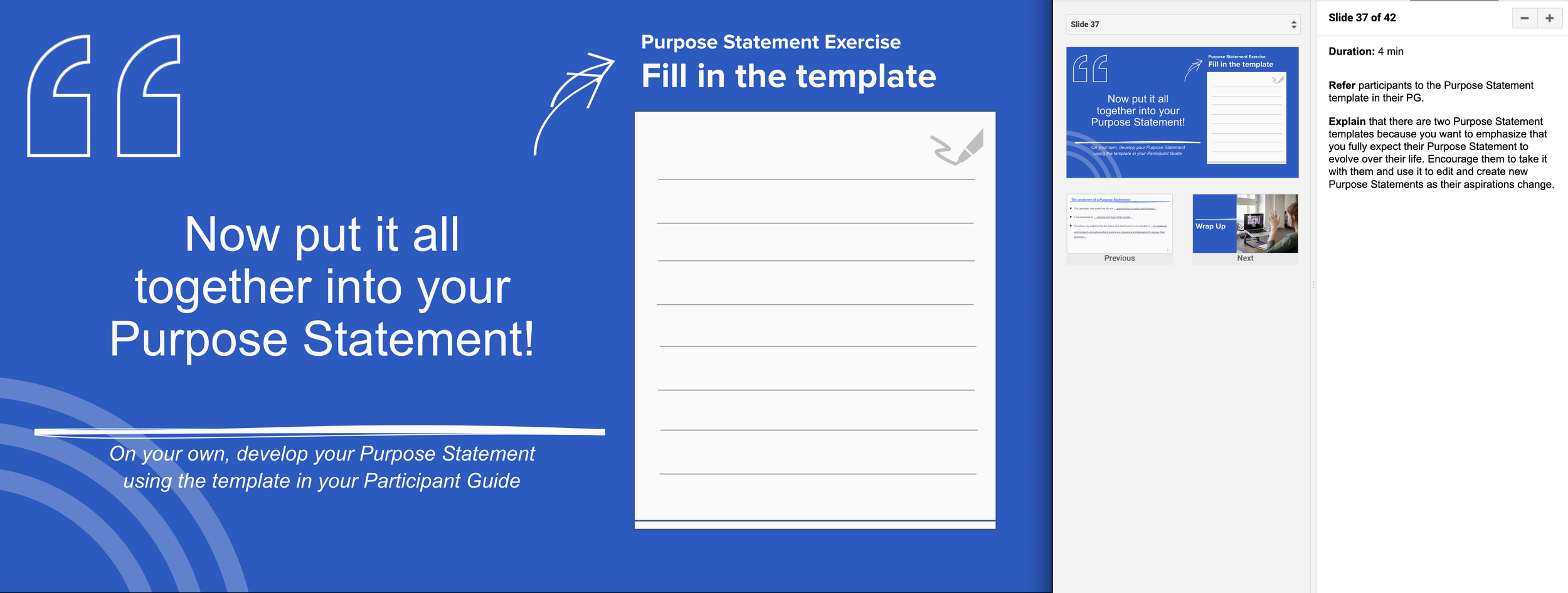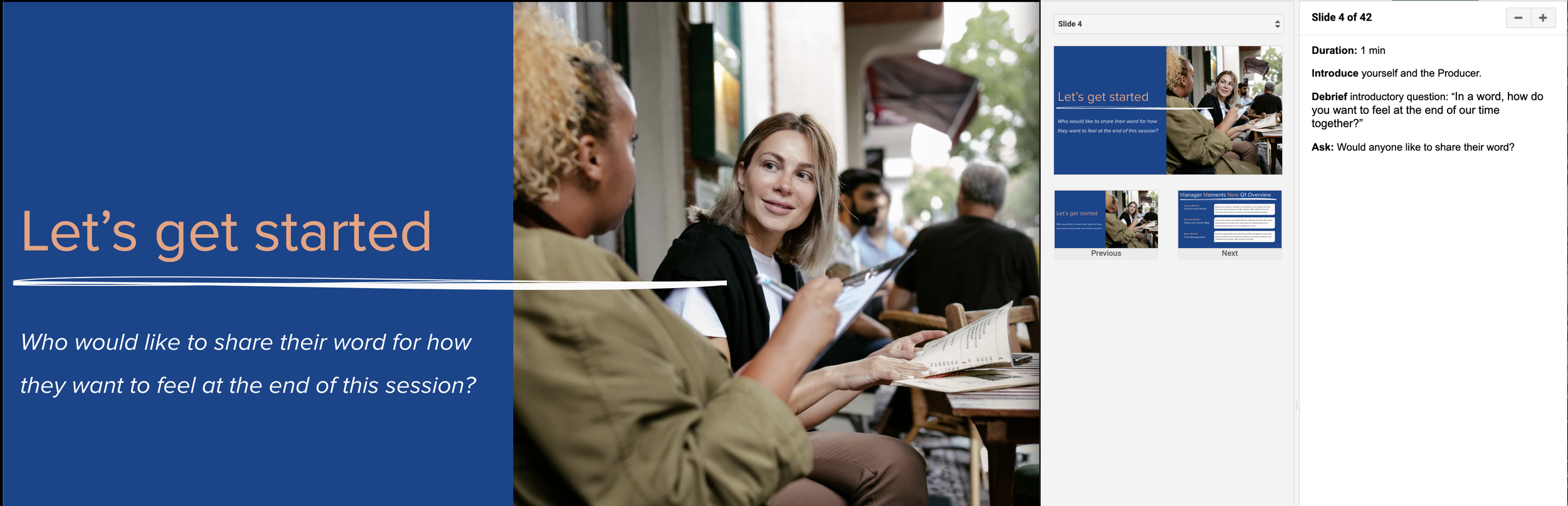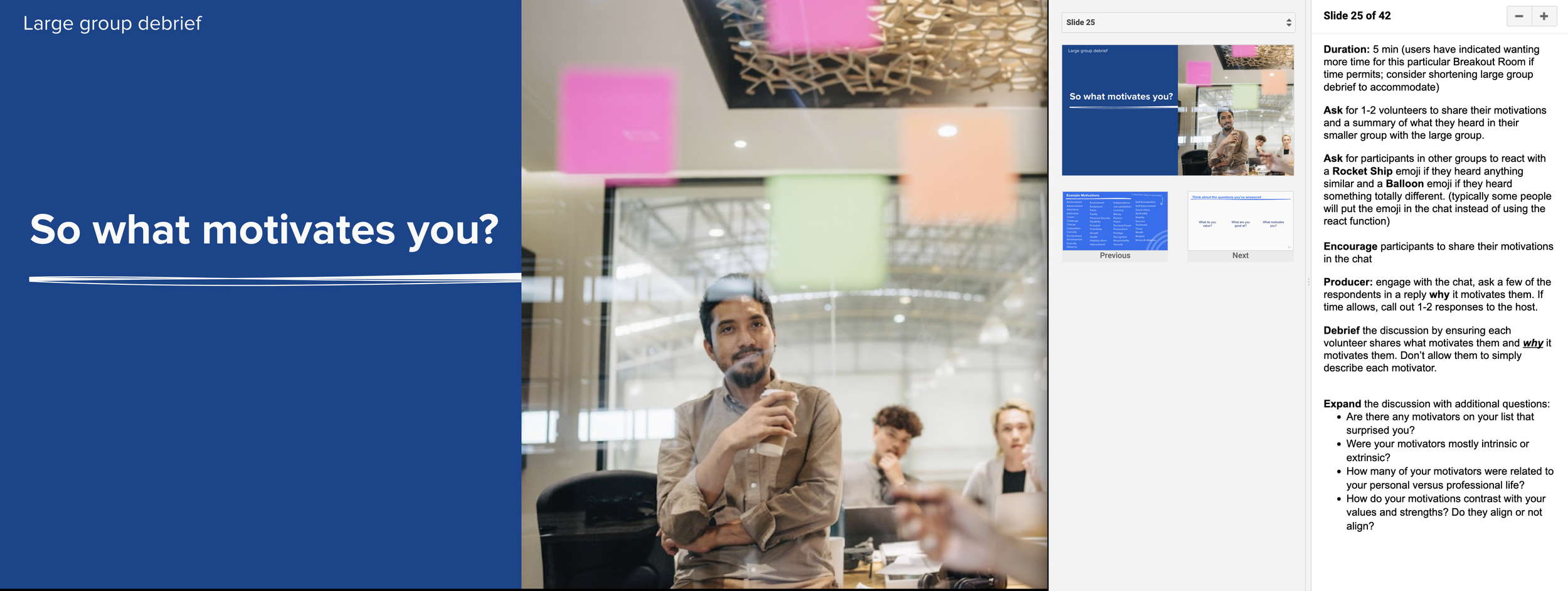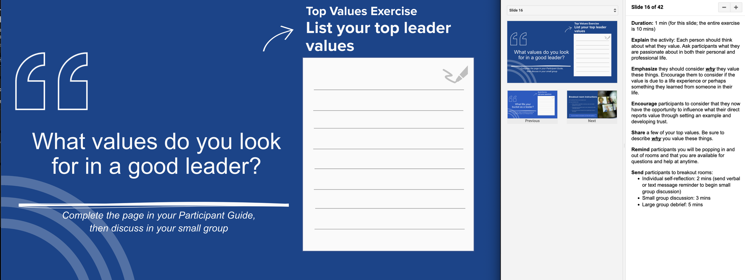 Collateral: The collateral developed was created following WCAG and ADA accessibility standards while remaining in line with the company’s branding guidelines. Facilitator and Producer directions are contained in the speaker notes. A participant guide was created to enhance and enable participant activities in the workshop. A sample of the participant guide can be found under the facilitator slides.