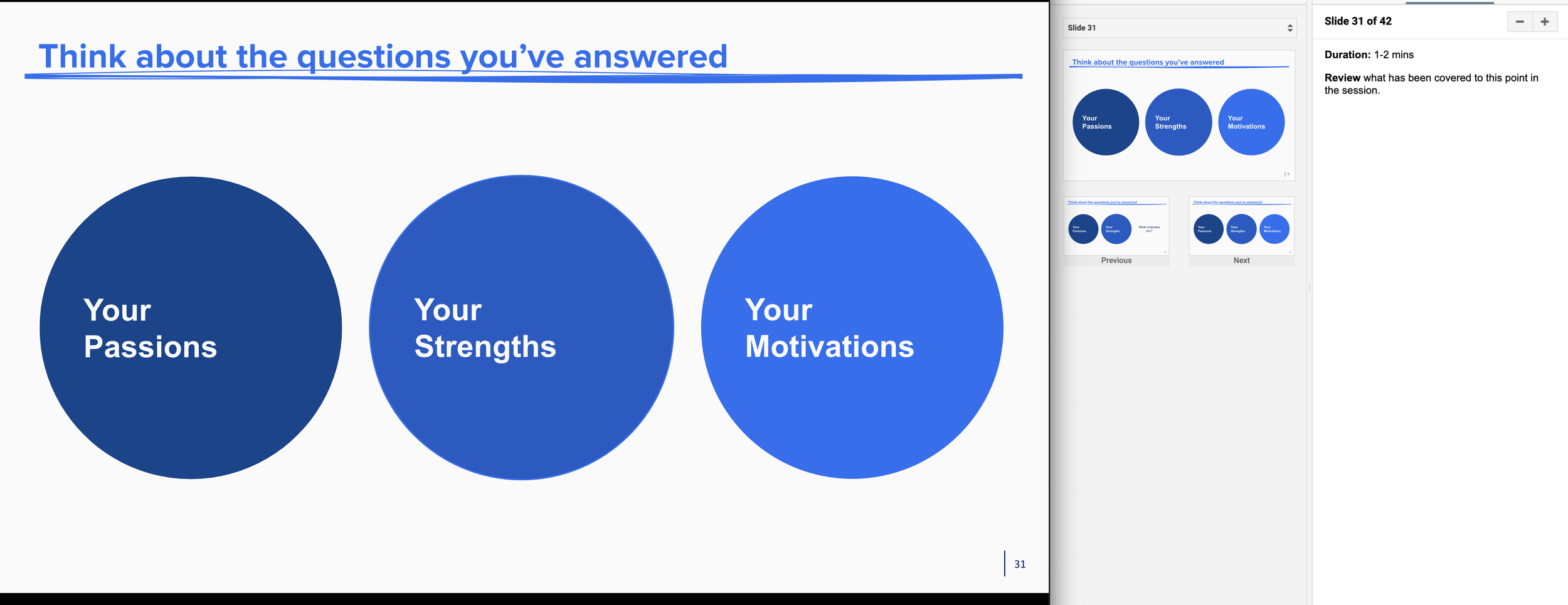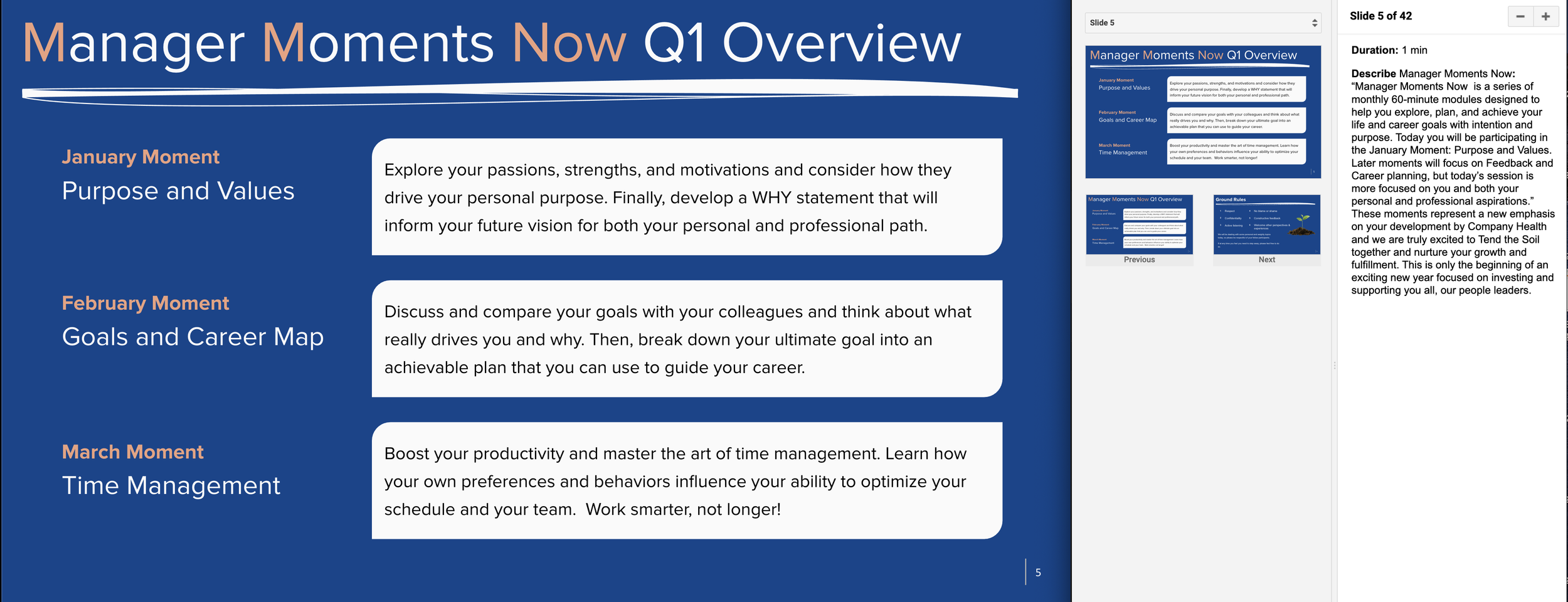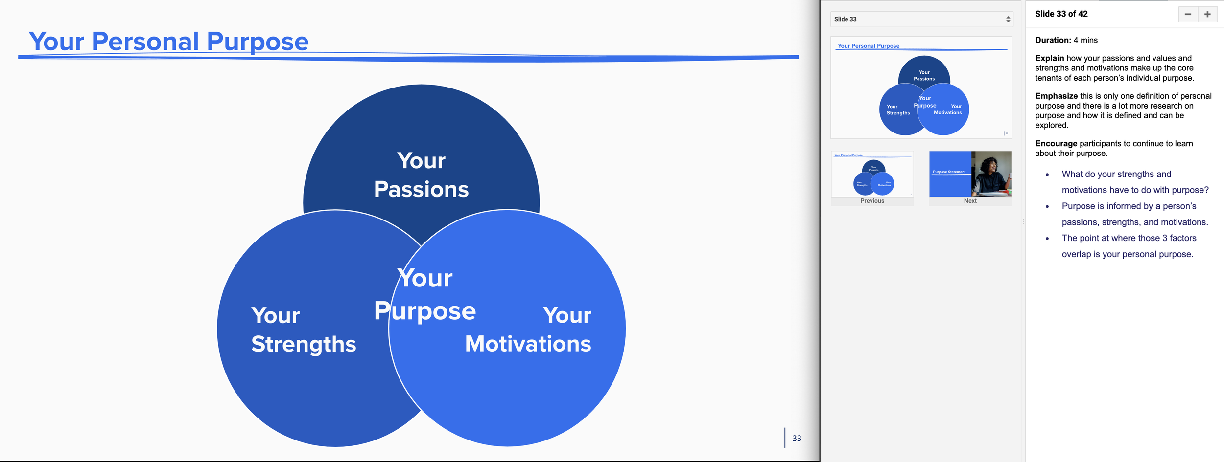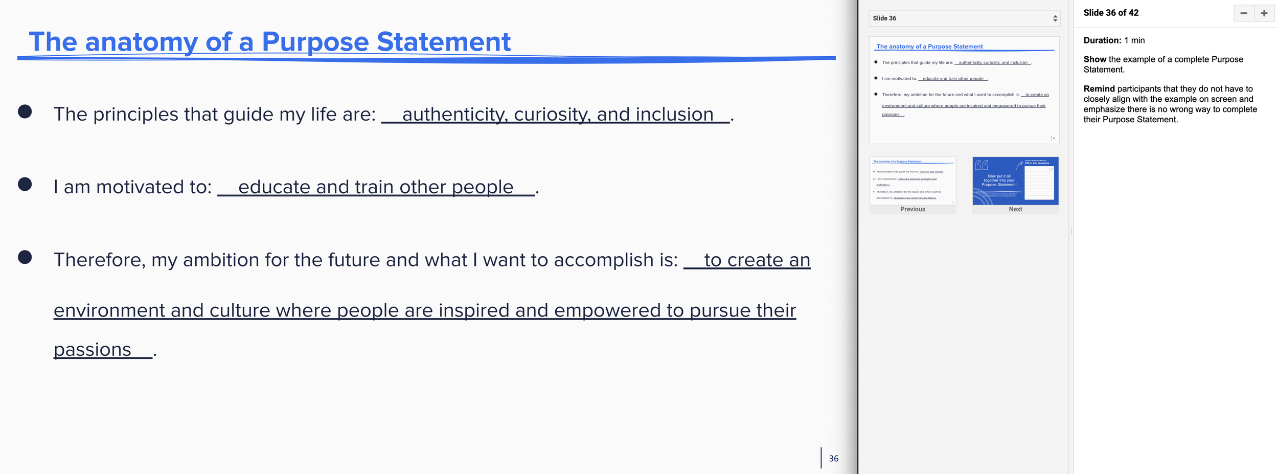 Project Brief: As part of a wider leadership development initiative, I created a series of monthly sessions for managers at a large health media company. The company had a high rate of internal promotions and was formed via a series of mergers and acquisitions, so one of the first problems I attempted to solve from an L&D lens was to set a singular expectation for managers at this company, informed by the company’s vision, purpose and values. Managers were led through various exercises including journaling exercises, breakout rooms, and polls to discover their Purpose and Values and connect them to their wider work and the work of their teams. This training was designed to be delivered by a facilitator in a one hour session.